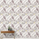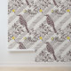 Dit behang heeft een patroon met diagonale lijnen, vogeltjes en gele naturen voor liefhebbers.