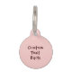 Roze inktvis chef-cartoon met snor met mes en kookvork. Aangepaste achtergrondkleur. Twee aangepaste tekstvelden op een cirkel. Aangepaste tekst aan de achterzijde.