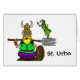 In dit ontwerp heeft St. Urho te maken met een sassy sprinkhaan die bovenop zijn stampvork zit en het "Vredesteken" met zijn rechterhand geeft. St. Urho stak zijn vork in die grasshoppers en liet ze uit Finland schrikken en redde de druiven. Wie wist dat die machtige daad hem tot een held zou maken? Dit is een leuke kaart om al je vrienden, al dan niet Fins, te sturen. Voel je vrij om dit aan te passen zoals je wilt.