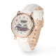 Een horloge met een foto met stenen stapels op elkaar. Omgeven door losse witte rotsen en kleine witte bloemen.