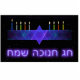 Een paars en blauw fractaal afbeelding, met een Magen David (Ster van David), in het midden, als Chanoeka-menorah. De kaarsen zijn aangestoken. Allemaal op een starre achtergrond.