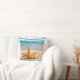 Een kussen met een schattige foto van een zeester die rechtop in het zand is geplaatst. Onder de armen zitten 2 kleine seizoenshellen die rustig rusten. Stel je op een strand met golven die op de achtergrond crashen.