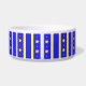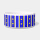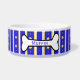 Witte keramische hondenvoer/waterkom, met blauw, wit en geel stripe patroon, met rijen gele sterren. Een groot zwart-wit de tekstgebied van de cartoon, op de voorzijde van de kom, heeft blauwe douanetekst klaar om, met de naam van uw huisdier te personaliseren. Een geweldig cadeauidee voor elke eigenaar van een hond.