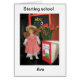 de startschool heeft veel plezier met een kleine blonde pop in een Victoriaans schooluniform met een bord en bloemen