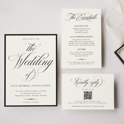 STATELY | Calligraphy, wedding rsvp card with meal choice. Trendy calligraphy typography template. Card Features, soft ecru white and onyx black color palette. Colors can be customized by using the design tool feature.
