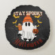 Bold ghost wearing an orange beanie with a jack-o-lantern bucket, set against spiderwebs and red Stay Spooky script—an energetic Halloween design for shirts and hoodies.