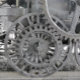 Een fotografisch ontwerp van de wielen van een zeer vroeg model van een stoomtrein.
