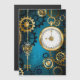 Turquoise, getextureerd, steampunk achtergrond met messing en gouden tandwielen, een zilveren sleutel en de klok. Steampunk-stijl.