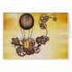 Steampunk-ballon met dunne mand en tandwielen op een verouderde achtergrond van geel/oranje gestreept patroon.