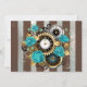 Gepatterde, antiek horloge, met sieraden, gouden uurtjes handen en Latijnse cijfers met turkooisachtige rozen op een bruine, gestreepte achtergrond. Steampunk-stijl.