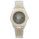 Samenstelling van een ronde steampunkklok met een zwarte Romeinse numerieke wijzerplaat, versierd met goud- en messenmakende versnellingen, blauwe Morpho-vlinders en beschadigde lenzen op een bruine gestreepte achtergrond. Steampunk.