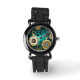 Juwelen, gouden horloge met een gouden ketting en sleutels op een groene texturele achtergrond. Steampunk.