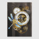 Antiek wijzerplaten met goud- en messenmazen, versierd met een mechanische libel op een bruine, gestreepte ondergrond. Steampunk.