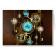 Turquoise-lenzen met een antiek horloge met messing tandwielen en gouden sleutels op een roestbruine achtergrond. Steampunk.