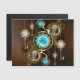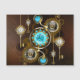 Turquoise-lenzen met een antiek horloge met messing tandwielen en gouden sleutels op een roestbruine achtergrond. Steampunk.
