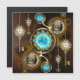 Turquoise-lenzen met een antiek horloge met messing tandwielen en gouden sleutels op een roestbruine achtergrond. Steampunk.