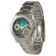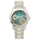Sieraden, gouden horloge met een gouden ketting en sleutels op een groene textuur achtergrond. Steampunk stijl.