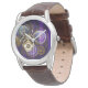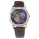 Steampunkspin, gemaakt van goud en staal, met antiek horloges met gouden tandwielen op een paarse, getextureerde achtergrond, met lenzen en messing. Steampunk.