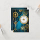 Turquoise, getextureerd, steampunk achtergrond met messing en gouden tandwielen, een zilveren sleutel en de klok. Steampunk-stijl.