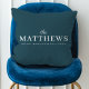 Een stijlvolle moderne fotovakantiekussen met uw achternaam die in klassieke typografie met een handgeschreven manuscriptdoopvont in wit wordt gecombineerd een prachtige donkergroene, donkergroene blauwe kleur op de achterzijde. Een leuk, minimaal ontwerp om uit de menigte te te komen dit kerstseizoen!