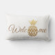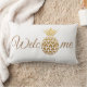 Stijlvolle en moderne gouden anananas op witte versierlumbale kussen met tekst, "'Welcome'. Neem contact met ons op voor hulp bij aanpassingen of om passende producten aan te vragen.