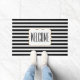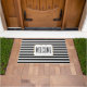 De grafische voordeurmat wordt gedaan in een zwart-wit horizontaal gestreepte patroon. Een wit decoratief tekstgebied, in het midden van de mat, heeft zwarte tekst klaar om zich te personaliseren. Wat een mooie manier om gasten bij je thuis te verwelkomen.