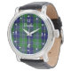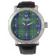 Stijlvol lederen bandhorloge, met het klassieke blauw, groen en wit clan Douglas tartan plaid patroon, op het gezicht, met witte cijfers en stippen voor de uren. Witte aangepaste tekst leest Abercrombie, en kan worden gepersonaliseerd om te lezen wat je wilt.