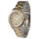 Dit man horloge heeft een geometrisch ontwerp van stippen in koraal, goud, en sage groen.