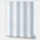 Een stoffig blauw en wit drie inch breed circus streep behang.