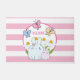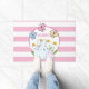Een welkome doormat met een roze en witte gestreepte achtergrond. Een wit cirkelvormig lijst met een roze rand die over de bovenkant met jouw tekst binnenin wordt gelaagd. In het lijst een afbeelding van een moeder en een baby bunny die samen staan. Gele daisies op de achtergrond. Whimsische vlinders fluiten over.
