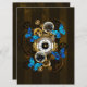 Compositie van ronde stoomstijlklok met zwarte wijzerplaat met Romeinse cijfers, versierd met gouden en koperen tandwielen, blauwe Morpho-vlinders en beschadigde lenzen op bruine gestreepte achtergrond. Stoomstijl.