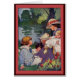 kleurrijke illustratie van een familie die op de oever van een rivier zit en een verhaal leest. Moeder en drie kinderen zien er cool en comfortabel uit onder de takken van een groene boom. Rood en zwart. Alle kaarten. Aanpassen zoals u wilt