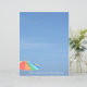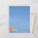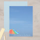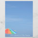 Dit blauwe briefpapier of plakboekpapier is strandachtig met een fotografische hemel, een heldere kleurrijke strandparaplu in de onderste hoek en "Life is Better at the Beach" aanpasbare tekst. Dit afbeelding is origineel kustfotografie door JLW_PHOTOGRAPHY.