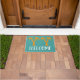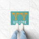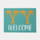 Een strand met palmbomen Zomer thema welkomstmat met oranje palmbomen in een strandthema tegen een blauw aanpasbare gekleurde achtergrond met welkomstbord. Een huiselijke, strand Zomer vibe welkom deur mat perfect voor uw huis.
