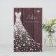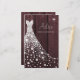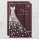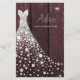 Witte glanzende diamanten trouwjurk op een donkerbordeauxrode houten achtergrond die een eenvoudige, elegante vrijgezellenfeesten advieskaart maakt.
