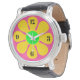 Groovy sixties horloge met gele en groene bloem op roze achtergrond. Conflicterende kleuren waren alle woede in de jaren zestig. Grote getallen op 12, 3, 6 en 9 voor gemakkelijk lezen. Wees bereid om dit horloge af te shows omdat het een origineel is, vooral omdat de jaren zestig lang geleden waren.