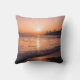 Verbluffende foto van een zonsondergang over een verlaten strand met bergen en palmbomen op afstand.