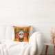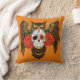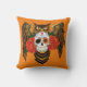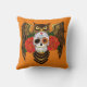 Een bruine grote hoornuil met een dag van de dode suikerschedel en rode rozen in een achtergrond van sinaasappel.
