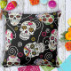 Een kleurrijk ontwerp van de gooikussens voor Dag van de Dode festiviteiten of om aan uw leuke, alledaagse eigenheid tegemoet te komen, met een verscheidenheid aan decoratieve suikerschedels met bloem- en zwembrilaccenten op een optionele zwarte achtergrond. Zoek ID725 om andere kleurenkeuzen en producten met dit leuke patroon te zien.