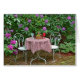Vruchtenmand op een tafel in een rhododendron tuin.