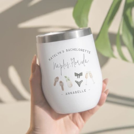 Krijg het feest op gang met deze schattige wijntumblers die gemakkelijk te personaliseren zijn voor je vrijgezellenfeest, 's nachts of meisjesweekend! Boho wijnstijl design heeft delicate waterverf illustraties van sandalen, champagneglazen, een gemengde cocktail en een chic zwart badpak met houtskoolgrijs accent belettering. Personaliseer met drie regels aangepaste tekst; getoond met de naam van de bruid, het type gebeurtenis, de locatie en de datum.