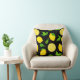 Een prachtig geworpen kussen met een citruspatroon met handbeschilderde citroenen met groene bladeren op een zwarte achtergrond. Het zal je huis onmiddellijk oplichten. Origineel ontwerp door Cute Muse Design.