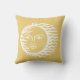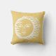 Een afbeelding van de zon als een menselijk gezicht wordt in wit gesilhoueteerd tegen een mosterdgele achtergrond.