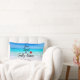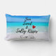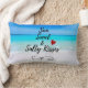Een lumbale kussen met een afbeelding van een tropisch strand met kristalheldere turkooiswateren en een wit zandig strand met een azuurblauwe lucht. De tekst zegt Sun Sand en Salty Kisses.
