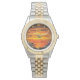 Schilderij "Sunset Plaza Marina 2584" Collectie Perfect voor dagelijks draag, kan dit zilveren en gouden tweekleurige horloge worden gepersonaliseerd om aan uw stijl te voldoen. Voeg jouw tekst toe om het aan te passen voor een geweldige stijlverklaring! Personaliseer op de productpagina of klik op de knop "Aanpassen" voor meer ontwerpopties. Het ontwerp gemaakt van mijn schilderij "Sunset Plaza Marina 2584" legt een levendige zonsondergang vast met strepen van sinaasappel en rode kleuren die de lucht vullen, omlijst door silhouetvegetatie en bloeiende planten op de voorgrond. De heldere tinten van de hemel contrasteren dramatisch met de donkere contouren van het landschap, waardoor een serene maar dramatische scène ontstaat. Bijpassende producten zijn beschikbaar in dit collectie.