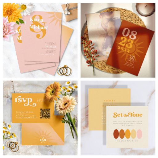 Deze leuke bruiloft RSVP kaart maakt deel uit van een levendige bruiloft suite met een kleurenpalet zo helder als een zonnige dag, variërend van steenrood tot perzik roze en goudsbloem. Het kleurrijke ontwerp wordt aangevuld met gedurfde typografie in een moderne, retro-geïnspireerde stijl, waardoor het de perfecte keuze is voor koppels die een vleugje zon willen toevoegen aan hun speciale dag. Zoek ID1048 om andere stukken en kleurkeuzes voor deze set te zien.