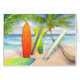 Kleurrijke surfplanken die op de kust en tussen de palmen zitten, geduldig wachtend op hun "Big Kahunas"! :: Oorspronkelijke Waterverf van Barbara Bayer