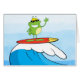 CARTOON KIKKER MET EEN ZONNEBRIL SURFEN OP EEN OCEAANGOLF