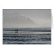 Twee surfers gaan naar buiten om de avondwateren van het Wickaninish Beach te testen terwijl de Pacifische oceaanmist van het water komt.