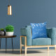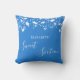Een kussen voor een Sweet 16, 16e jaar oude meisjeskamer. Een helderblauwe achtergrond versierd met witte sterren. De tekst: Sweet Sixteen is geschreven in wit met een groot modern handgeschreven stijlschrift. Een naam personaliseren en toevoegen.
